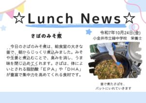 今日のさばのみそ煮は、給食室の大きな釜で、朝からじっくり煮込みました。みそや生姜と煮込むことで、臭みを消し、うま味を閉じ込めてくれます。さばは、体によいとされる脂肪酸「EPA」や「DHA」が豊富で集中力を高めてくれる食材です。