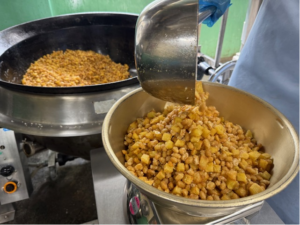揚げた大豆とじゃがいもを、カレー粉と塩で味付けしています。