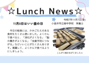 今日の給食には、かみごたえのある食材をたくさん使いました。よくかんで食べると、「消化がよくなる」「脳の働きがよくなる」「虫歯予防につながる」などいいことがたくさんあります。意識して、よくかんで食べるようにしましょう。