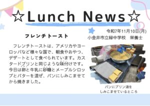 フレンチトーストは、アメリカやヨーロッパなど様々な国で、朝食やおやつ、デザートとして食べられています。カスタードプリンと同じような味付けです。今日は卵と牛乳に砂糖とメープルシロップとバターを混ぜ、パンにしみこませてから焼きました。