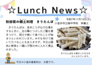 きりたんぽは、昔木こりが山で仕事をするときに、木の棒につぶしたご飯を巻きつけて、焚火で焼いて食べたことが始まりといわれています。みそを付けて焼いてたべることもありますが、今日は鶏肉と野菜と一緒に汁物の中に入れて煮込みました。