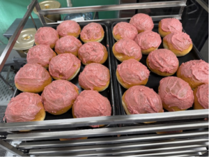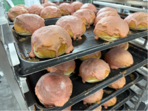 ビスキュイパンは、桜風味のビスケット生地をパンにのせて焼いたもので、メロンパンのようになります。