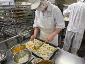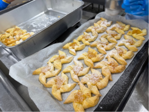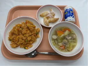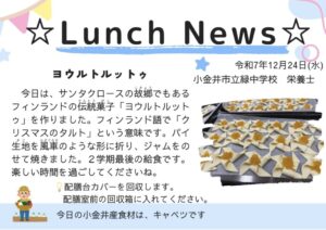 今日は、サンタクロースの故郷でもあるフィンランドの伝統菓子「ヨウルトルットゥ」を作りました。フィンランド語で「クリスマスのタルト」という意味です。パイ生地を風車のような形に折り、ジャムをのせて焼きました。2学期最後の給食です。楽しい時間を過ごしてくださいね。