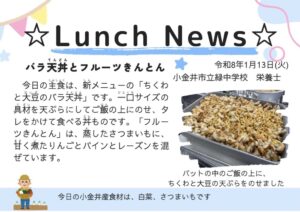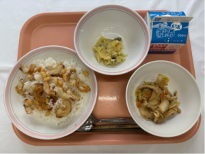 今日の主食は、新メニューの「ちくわと大豆のバラ天丼」です。一口サイズの具材を天ぷらにしてご飯の上にのせ、タレをかけて食べる丼ものです。「フルーツきんとん」は、蒸したさつまいもに、甘く煮たりんごとパインとレーズンを混ぜています。