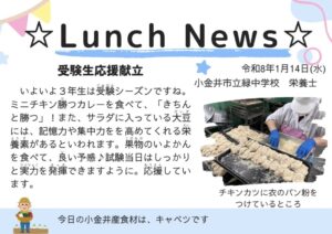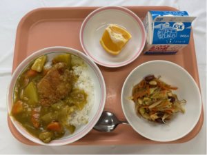 いよいよ3年生は受験シーズンですね。ミニチキン勝つカレーを食べて、「きちんと勝つ」!また、サラダに入っている大豆には、記憶力や集中力をを高めてくれる栄養素があるといわれます。果物のいよかんを食べて、良い予感♪試験当日はしっかりと実力を発揮できますように。応援しています。