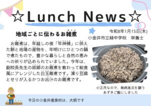 お雑煮は、年越しの夜「年神様」に供えた餅と地場の産物を、年明けにひとつの鍋で煮たもので、豊かな暮らしと自然の恵みへの祈りが込められていました。今年は、副校長先生の故郷のお雑煮を教わって給食風にアレンジした白玉雑煮です。凍り豆腐とせりが入るかつお出汁のお雑煮です。
