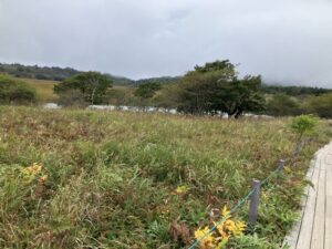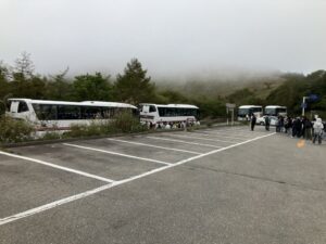ここから八島湿原を抜けて駐車場まで。慣れない山道に苦戦する生徒も。山の天気は変わりやすいです。駐車場についた頃にはガスにおおわれた白い世界になっていました。