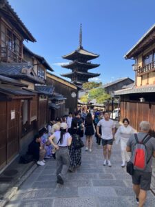 清水寺から八坂神社にかけては歴史的な景観が保たれている地域です。今日も青空、汗ばむ陽気です。